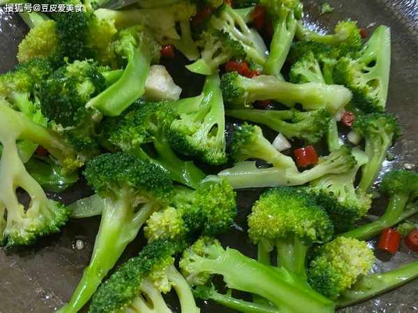 4、锅里下入小米辣,蒜末爆香,下入西兰花,大火快速翻炒2分钟。