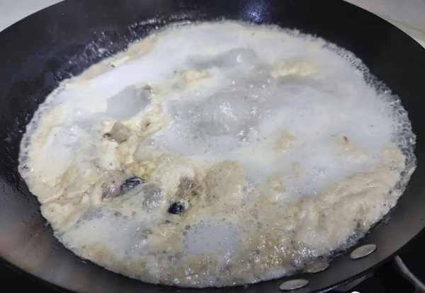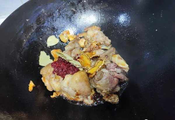 7.铲子将锅中的食材翻炒均匀,舀上一勺的酒糟。红酒糟舀入后可以加入里面的一些酒,然后用铲子翻炒均匀炒香;(有人问什么是酒糟?其实就是自酿的米酒里面的发酵后米粒)