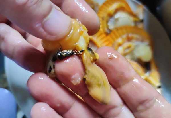 3.直接下手将扇贝肉里面的肠子也扯掉,有些人觉得这些是可以吃的。其实这是内脏,不能吃,要去掉。处理后,用清水清洗干净,洗净放在一旁备用;