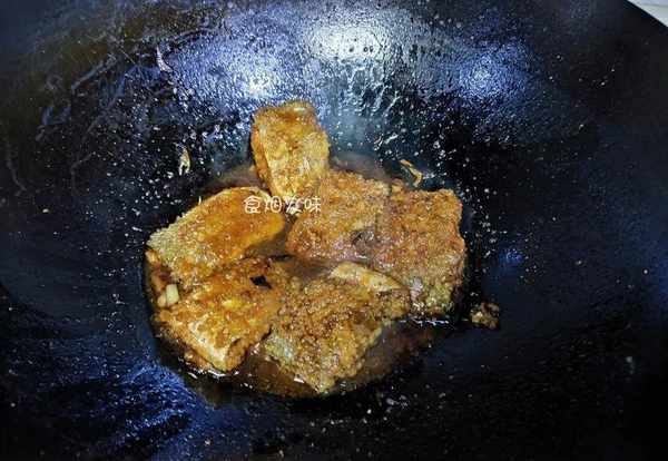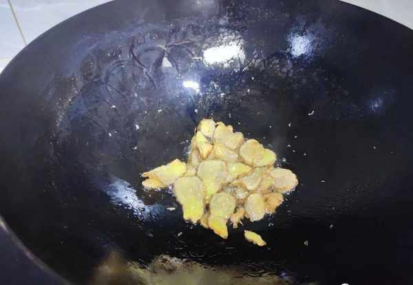 4.锅中的水分干后倒入适量的油,将油要稍微多一点,将生姜片下锅,用小火煸炒经过煸炒,炒到食材发出浓郁的生姜味,生姜的表面有点焦,这个状态最佳;