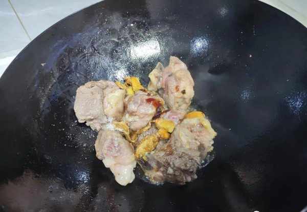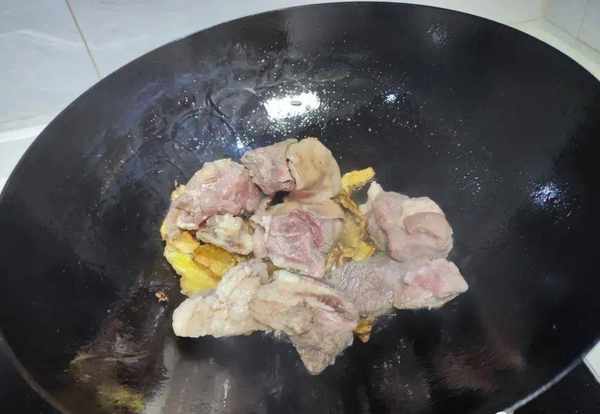 5.生姜炒香后,往里面加入一勺的白糖。白糖下锅后用小火将糖炒成糖浆,然后把洗净后的羊肉倒入锅内,用铲子翻炒,使得羊肉表面都裹上一层糖浆;