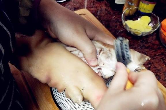 起冷水锅加入猪蹄,料酒,2片姜大火煮开捞出浮沫后捞出猪蹄沥干水备用(如何去腥?此步骤目的是去腥,冷水下锅是为了在水越来越热的时候慢慢把五花肉里面的血水逼出来。这个方法也可以用在排骨,鸡肉等肉的去腥。如何判断冷水下锅还是热水下锅?如果肉是新鲜的,也可用沸水下锅,若肉不太新鲜或者冷藏冷冻过,则要冷水下锅)。