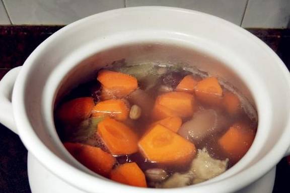 经过90分钟,这碗香喷喷的营养汤就完成咯~盛上一碗,满满的骨胶原和营养。还有这种滋补汤用瓦锅煲会更香,营养不会流失,因为瓦锅保温性会更好。假如大家嫌麻烦,也可以用电瓦煲,先把药材放进去煲一会(出味),再放猪手,最后放胡萝卜。按定时90分钟即可。是不是很简单?