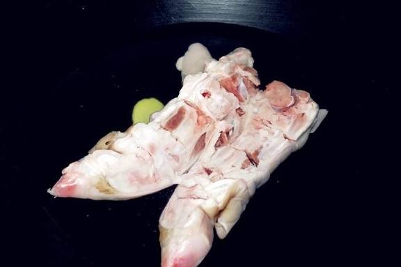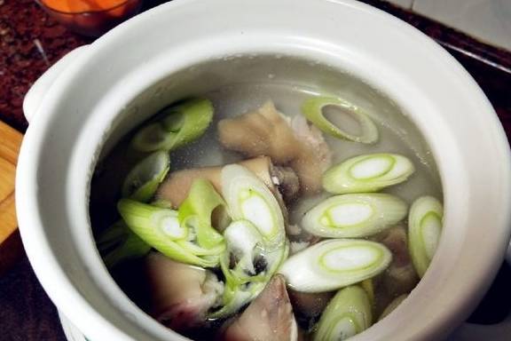 开火起瓦锅加入冷水,放入葱、姜(去腥作用)煮开后加入猪蹄,大火煮开后再煮20分钟。
