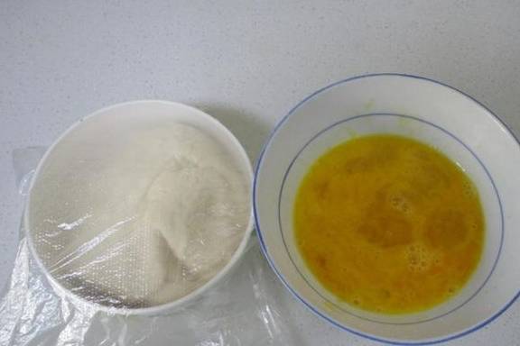 面粉里加入110克温水揉匀盖上保鲜膜静置半小时,鸡蛋里加入2克盐搅打均匀