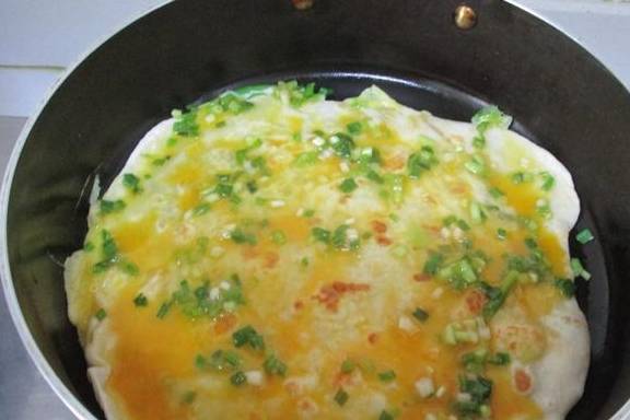 把蛋液倒入,再把葱花均匀的撒入转小火煎至蛋液凝固