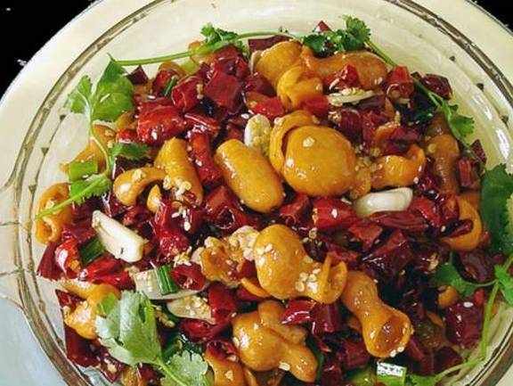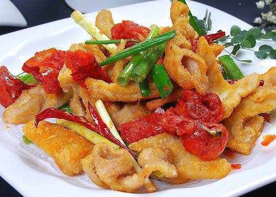 干煸大肠材料:大肠800g,杏鲍菇3只,洋葱丁小洋葱1/2,生姜3g,小米椒,适量生抽30ml,料酒30ml,糖10g,胡椒粉少许,醋少许,孜然粉少许,盐适量