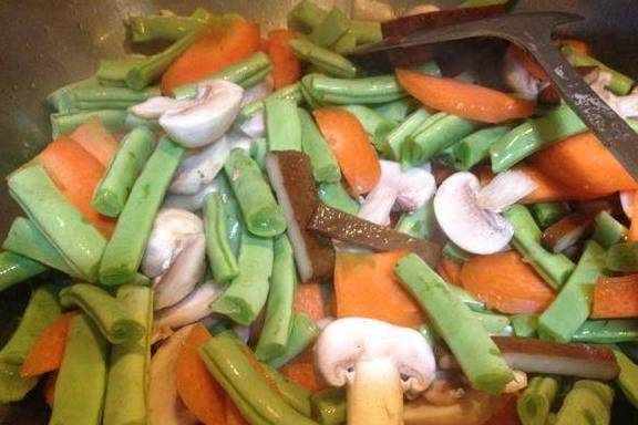 倒入四季豆,胡萝卜片,口蘑片,豆腐干