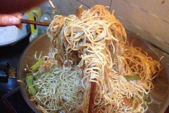 汤料倒入的量要几乎快淹没面了,但不能没过面哦。这点一定要注意,不然的话炒好后会很烂的。六,七分钟后闻到很浓郁的面香,并且打开锅盖后发现锅内的水分也变少了。就像我这样用两根筷子将面沾上汤汁从下往上全部挑散。边挑边抖