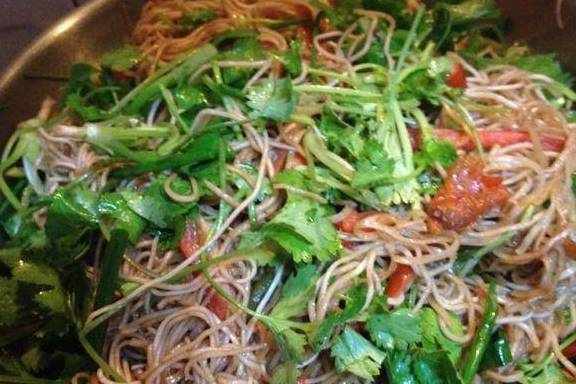 最后放入香菜,小葱段,青红椒丝一齐翻拌