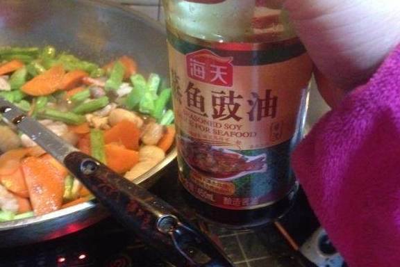 倒入适量蒸鱼豉油,老抽,盐,鸡精,少许蚝油,一碗水,翻炒均匀后盖上锅盖焖五,六分钟