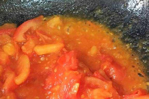 2.起锅热油,倒入西红柿,加半勺盐和1勺糖,开中小火慢慢翻炒,直到变软褪皮,汁水外溢。西红柿没有提前去皮,是为了更好地锁住汁水,保留酸酸甜甜的味道。