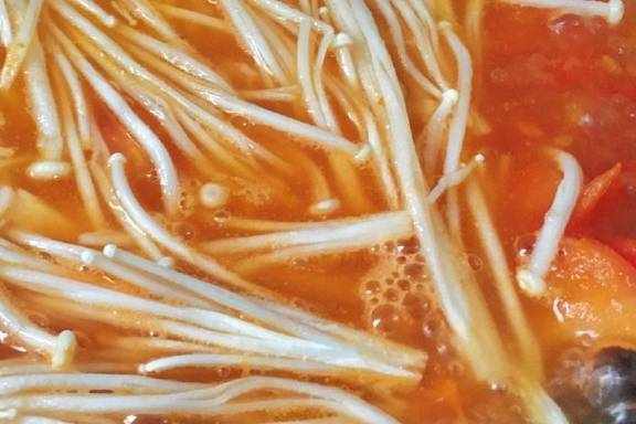 3.加开水(别加太多,2-3小碗汤的量即可),转为大火,放入金针菇,尝一尝调味,根据自己口味加入适量的盐,大约煮1分钟即可。