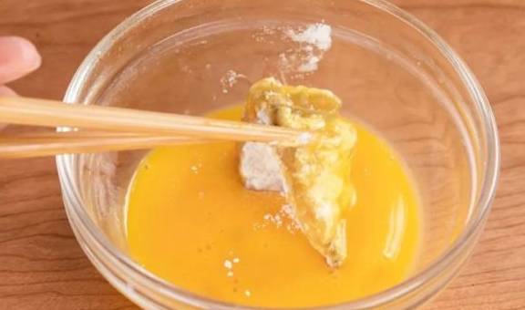 4.鸡蛋打散备用;夹一块鱼肉,两面沾上面粉;再放入鸡蛋液中浸一下;