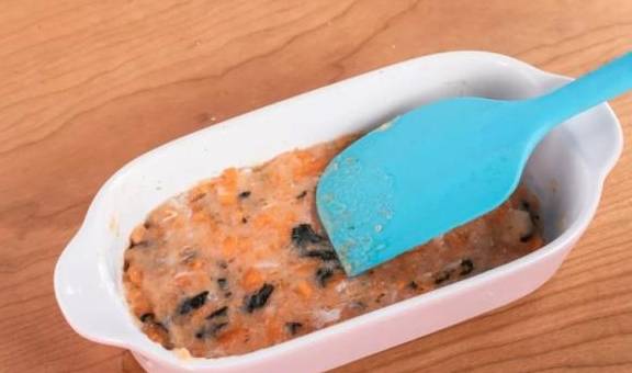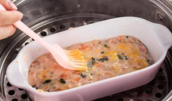 8.倒入搅拌均匀的鱼泥,用勺子或刮刀抹平;