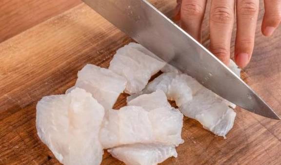 2.龙利鱼洗净后,沥干或用厨房纸巾吸干水分,切成小块;