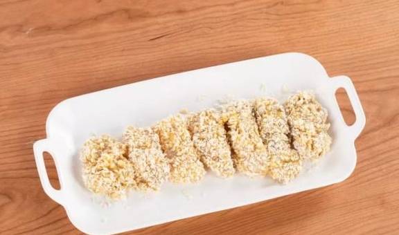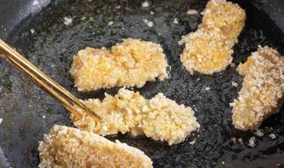 5.最后两面沾上面包糠备用;
