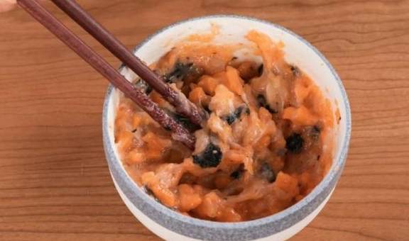 6.将打好的鱼泥放入碗里,继续用筷子搅拌起劲儿;放入胡萝卜,再放入海苔碎,用筷子搅拌均匀;