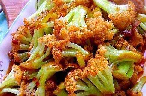 9.看勺里的汤被菜花吃透,上色,花软,最后一定要淋入芡汁,也就是水淀粉,顺锅边淋入,让花充分裹上汤汁,色泽鲜亮,淋入香油,顺锅边淋入少许醋,翻勺出锅!