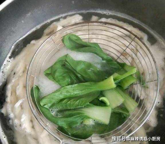 6.将油菜放入面条的锅中烫熟捞出备用。