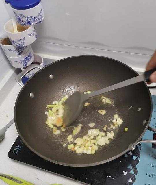 4.油烧开,爆葱蒜,加姜粉,至有香味,微变色