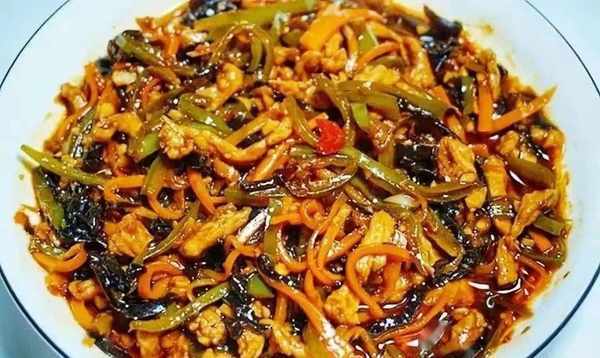 食材:瘦肉100克,胡萝卜50克,木耳80克,青椒1个,大蒜5瓣,淀粉1勺,豆瓣酱1勺,料酒2勺,生抽3勺,白糖3勺,醋4勺
