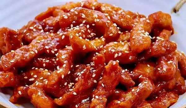 4:锅中加少许油,倒入提前调好的糖醋汁,小火煮开。放入炸好的里脊肉,快速翻炒,使里脊肉均匀地裹上糖醋汁,撒上白芝麻即可。