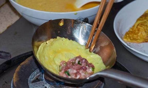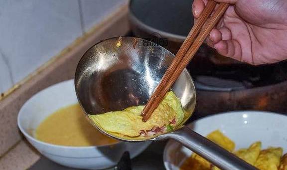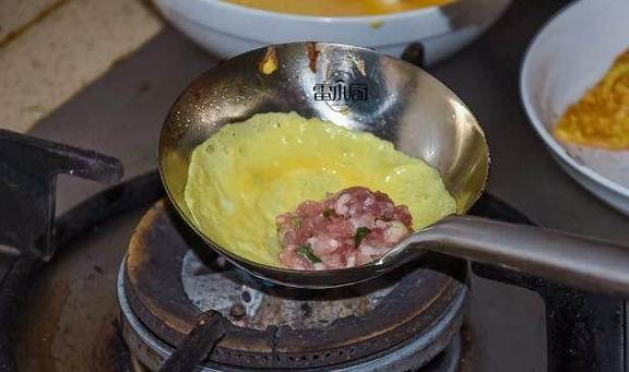 2、汤勺加热后放少许油,加入少许蛋液覆盖三分之二汤勺,注意控制火候,最好用文火。