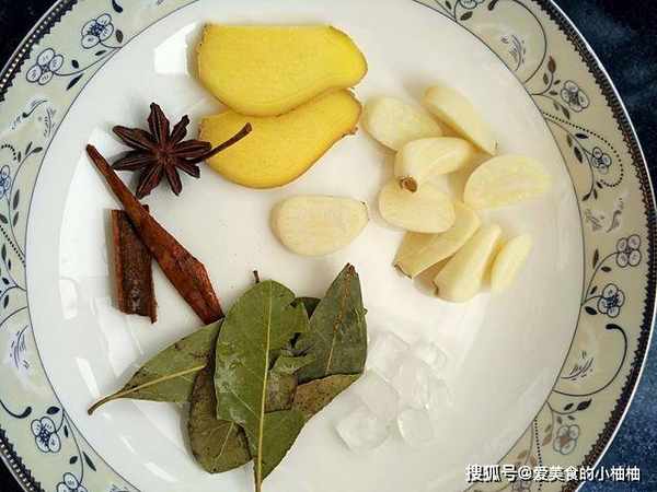 3、准备辅料,少了其中一样出不了味道,八角1个,香叶4片,葱姜蒜适量、冰糖适量、肉桂适量,料酒,老抽,生抽。