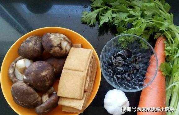 【食材准备】:香菇200克,豆腐干150克,黑木耳一小把,胡萝卜半截,大蒜4,5瓣;食盐,胡椒粉,花椒粉,生抽,老抽,蚝油,鸡精,植物油,香油各适量。