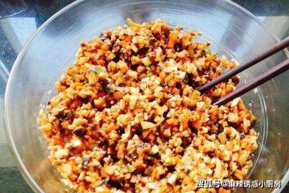 6.搅拌至所有菜粒充分裹上油分后,加入1勺胡椒粉,半勺花椒粉,1勺生抽,1勺老抽,1勺蚝油,小半勺鸡精,1勺食盐,1勺香油再次搅拌均匀即成饺子馅。这里先浇热油再调味,一是为了增香,二是让蔬菜先裹上油分以后再加盐就不会出水,这样做即可以避免营养流失,也不用再担心饺子出水破皮的问题。