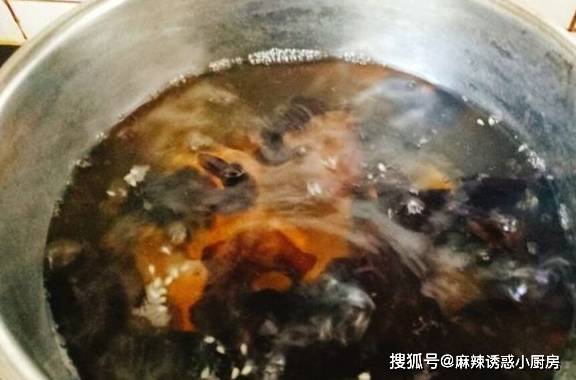 3.接着下入泡好的黑木耳,焯水5分钟之后捞出,沥干水分之后切成木耳碎。