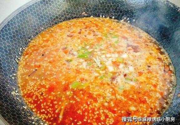 5.炒锅倒入适量油,放入一小把花椒,中小火炸出香味之后,拣出花椒粒不要,然后将热花椒油浇入大碗中。