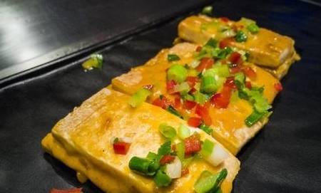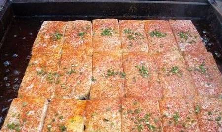今天我们介绍的这种豆腐呢,是一位河南大妈制作的,这位河南大妈在制作这种豆腐的时候,用的都是嫩豆腐,比起老豆腐更加的鲜嫩,而这位大妈的制作手法也是比较奇特的,她在制作豆腐的时候,不是炒,不是油炸,而是用铁板烧煎制的豆腐。大妈把豆腐切成均匀的小块之后呢,放在铁板烧上面,然后根据她的经验,放入搭配好的调料,还有酱料,就这样经过来回的煎制翻面之后,最后撒上葱花,一锅美味的铁板烧豆腐就煎制而成了,这种豆腐看起来外表是金黄色的,看上去非常的诱人好吃。