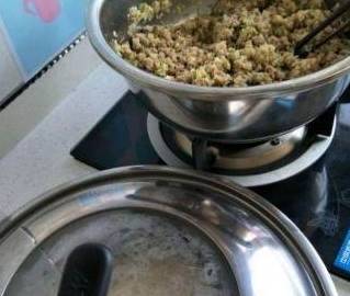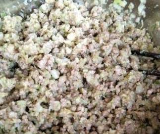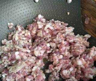 5、锅加热,倒油,把肉馅放入锅中翻炒熟(冷锅冷油炒不然就粘锅了)