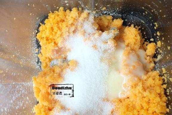 把蛋黄碎放入料理机加入炼乳、细砂糖、牛奶一起打成顺滑