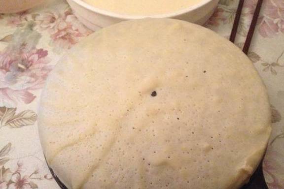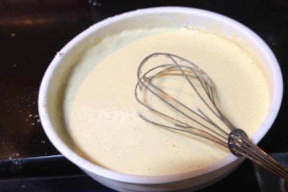 一点一点的加水,用手动打蛋器搅拌均匀。成这样的稀糊状,水状哈,有点像淡奶油。