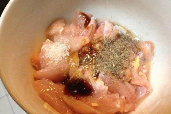 教程来了,首先选两个大鸡腿,剔除骨头后,切成条状。加入料酒,盐,鸡精,糖,蒸鱼豉油,胡椒粉,姜片,蒸鱼豉油腌制一小时左右。