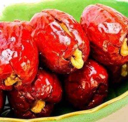 枣夹核桃,红枣中含有丰富的维生素c和,铁,铜,锌等微量元素。核桃又是天然的最佳补品。多吃能够清理身体的毒素。让身体更健康。除此之外,还能降低血清胆固醇,也有很好的降压降脂效果。