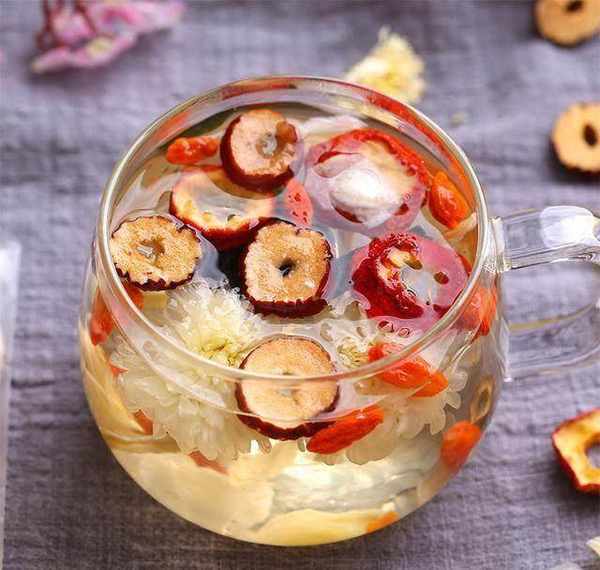 枸杞红枣桂圆都是补血补气的佳品。枸杞可以滋补肝肾、明目、润肺、抗衰老。煮桂圆红枣茶的时候加一点枸杞,能增加香甜味又有营养。常喝红枣桂圆枸杞茶的女性朋友,皮肤白皙,美容效果不错。每天早上上班后给自己泡一杯,不但补气血,还能明目,特别适合长期待在电脑前的办公一族。