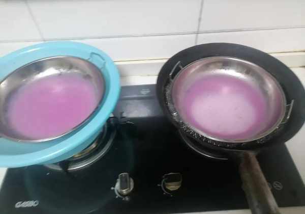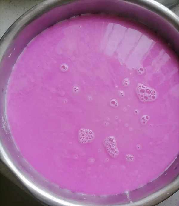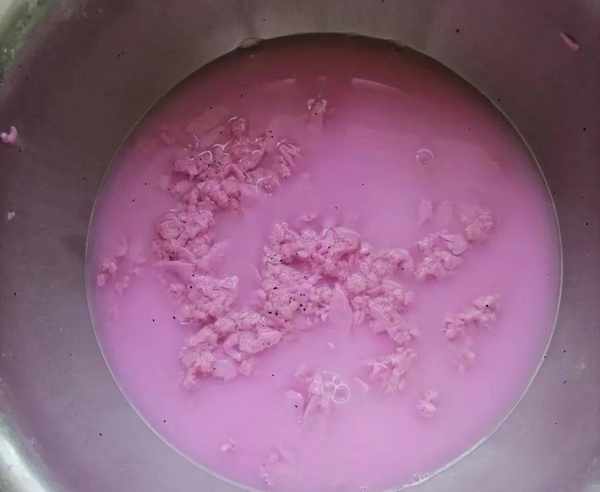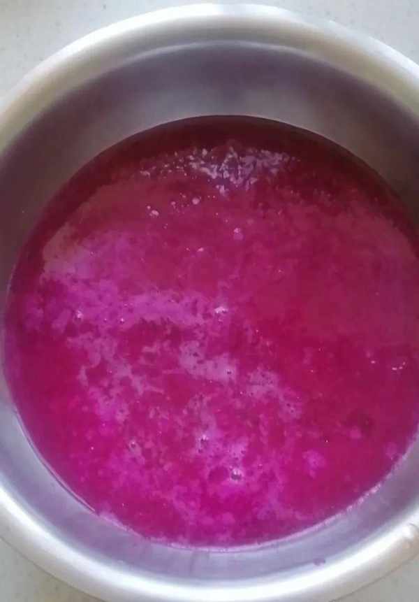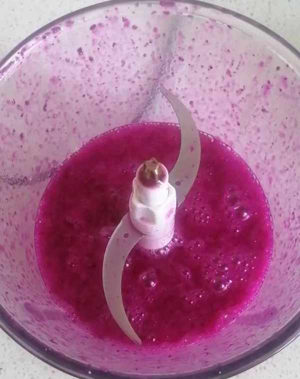 1、火龙果去皮,切成小块,放入搅拌机中打碎,过滤掉剩余的果肉,保留紫红色的汁液。