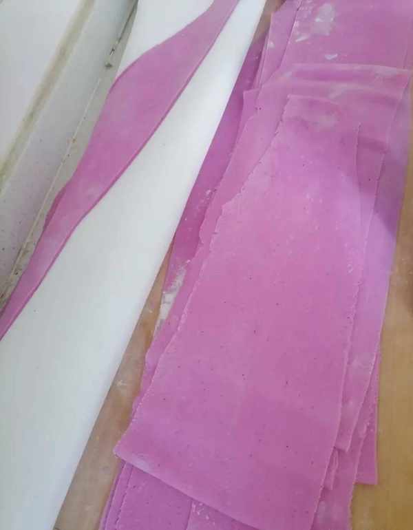 4.用刀切成宽约15厘米的条状。5毫米(宽度看个人喜好),然后配上自己喜欢的汤,一碗五颜六色的面条就出炉了。