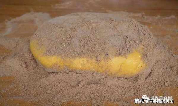 10、将黄豆粉撒在桌面上,放入冷却的红薯泥,表面再撒一层黄豆粉。