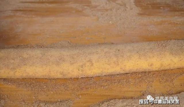 12、接着,将沾满黄豆粉的面皮,从下方卷起来,形成长长的一条造型。