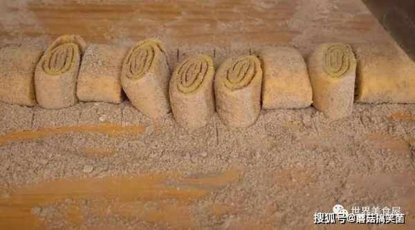 13、再用刀子,将它切成均匀的小段,这个红薯卷就完成,有点像驴打滚。