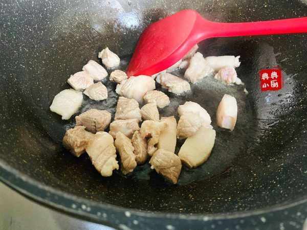 猪肉炒出香味之后,把切好的白素鸡倒进去翻炒至上色。