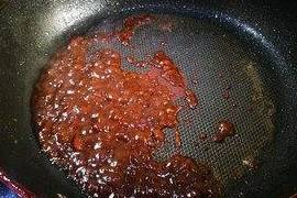 4.底油,小火炒1勺黄酱1勺甜面酱,加入料酒去异味,炒开后加少量的水,1勺白糖半勺老抽,煮开。