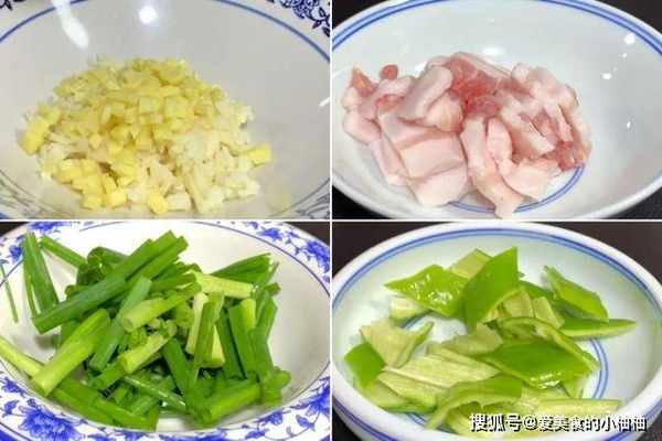 3.接着准备一些配菜,大蒜切蒜末,生姜切姜末,五花肉切薄片,青椒切菱形片,小葱切葱段。