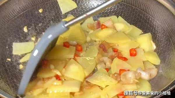 8.倒入土豆片,开大火爆炒,炒干水分,炒至断生。