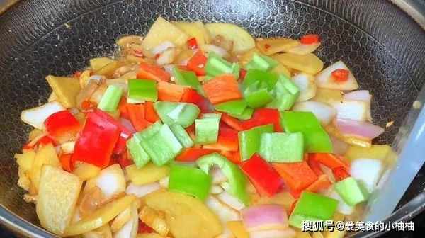 11.倒入青红辣椒块,快速翻炒,炒10几秒左右即可。